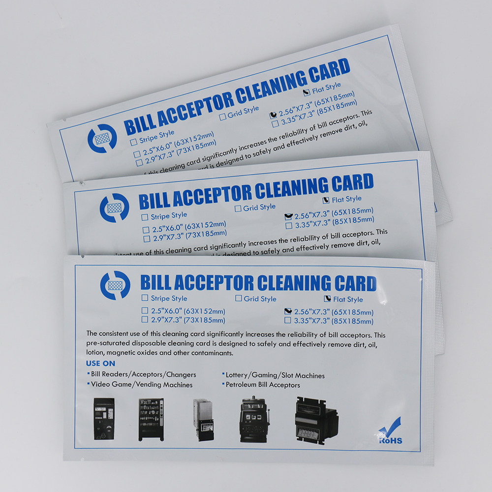纸币识别器清洁卡是一种专为纸币识别设备(如点钞机、验钞机、自动售货机等)设计的清洁工具,通常采用柔软、耐用的材质制成,并含有特定清洁溶剂具有强吸附能力,旨在有效清除设备内部传感器、滚轮、通道等关键部件的灰尘、纸屑、油污等杂质,确保设备的正常运行和准确性。
