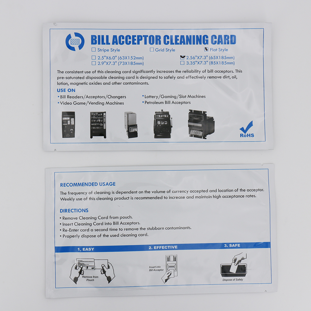 纸币识别器清洁卡是一种专为纸币识别设备(如点钞机、验钞机、自动售货机等)设计的清洁工具,通常采用柔软、耐用的材质制成,并含有特定清洁溶剂具有强吸附能力,旨在有效清除设备内部传感器、滚轮、通道等关键部件的灰尘、纸屑、油污等杂质,确保设备的正常运行和准确性。